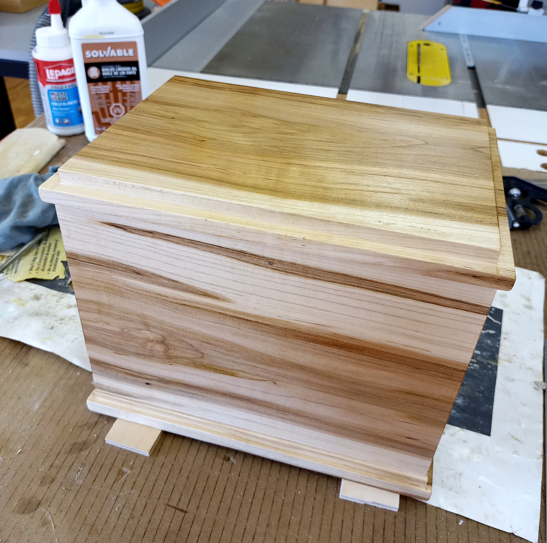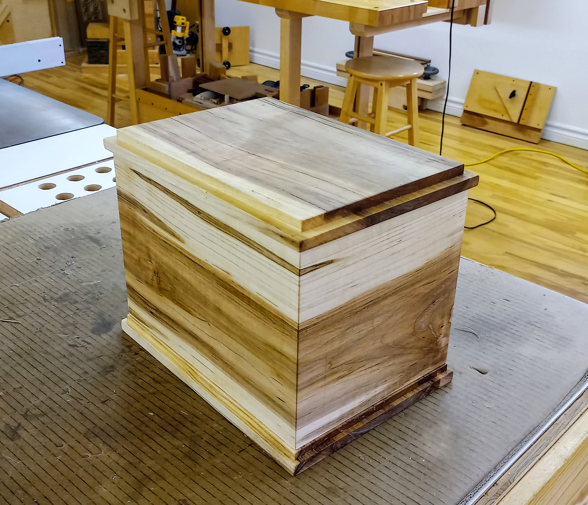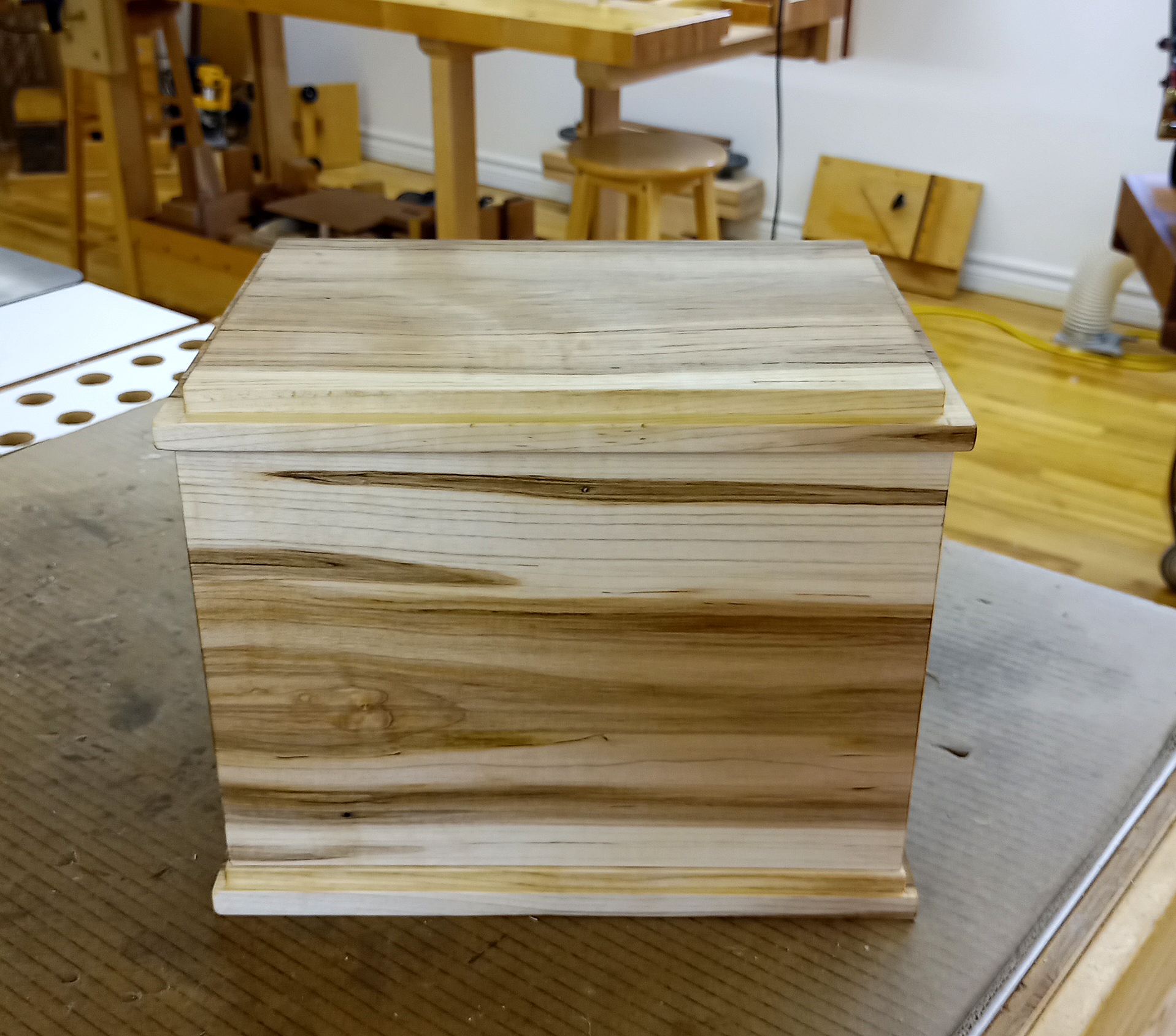For this particular custom urn, the client requested a rustic aesthetic. I decided on and selected some figured, domestic soft maple with an interesting grain pattern. In the construction of the urn, I ensured that the grain wrapped correctly around the box. The wood originated from a long, wide single board of soft maple so the sawn pieces were marked for assembly after creating the joinery. The joinery was mitered corners and the top was rabbeted and glued into the case of the urn. The bottom panel was also rabbeted but instead screwed in for removal. The bottom panel is also keyed using dowels for easy re-assembly after removing. The finish I decided on was a boiled linseed oil finish that can be easily re-applied if necessary. This finish protects the wood and also enhances the grain of the wood. Overall, an excellent experience and I learned quite a bit from the build!