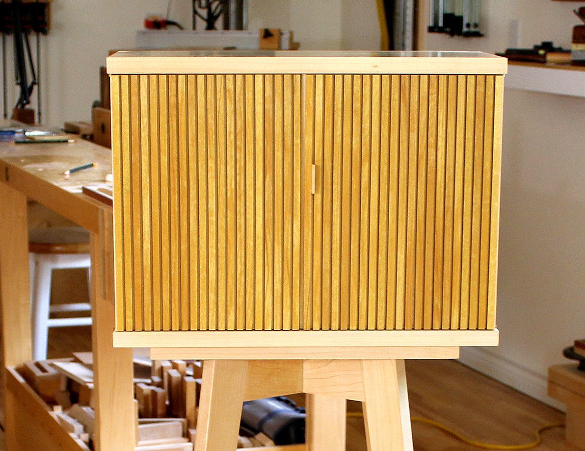 The third version is a twist on tambours. Tambours slide along tracks and are typically used in cabinets, credenzas or sideboards. The tambour concept was modified to instead be fixed in this new set of doors. Since this was a one-off design, tambour strips were individually created and glued to a hardwood substrate. I did develop an alignment jig to ensure the tambour spacing was uniform across the two doors. The design was a challenge and the effort was successful. Feedback so far is very positive!